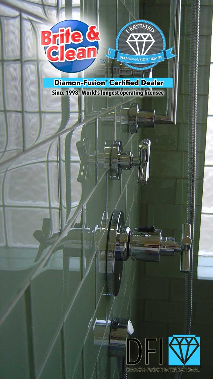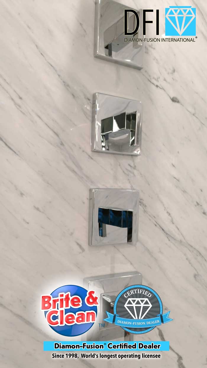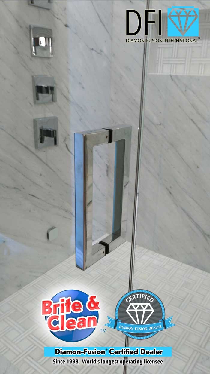 In addition to protecting the tile and glass surfaces in the shower, the 2nd stage of the Diamon-Fusion® process can 'cap' the metal with a protective coating that is used in the Diamon-Fusion® process. Because the first-stage of the 2-stage Diamon-Fusion® process bonds only to silica, metals are not compatable with that first stage. However, the 2nd stage does bond to the metal and imparts protective properties to the metal surface that makes is easier to keep clean and requires less effort in doing so.